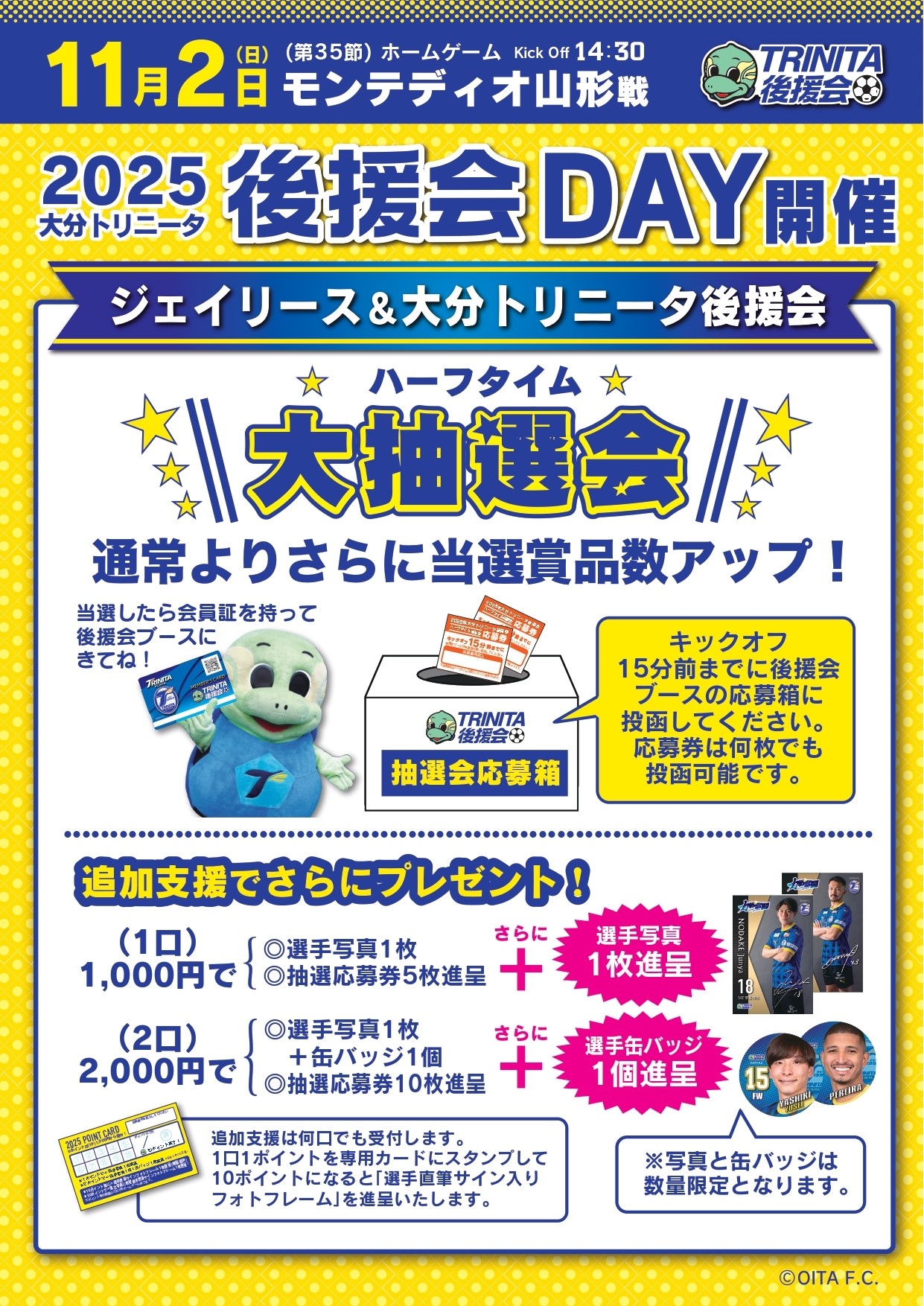 【イベント】11月2日(日)2025明治安田J2リーグ第35節 モンテディオ山形戦「ジェイリースサンクスデー & 大分トリニータ後援会DAY」開催のお知らせ