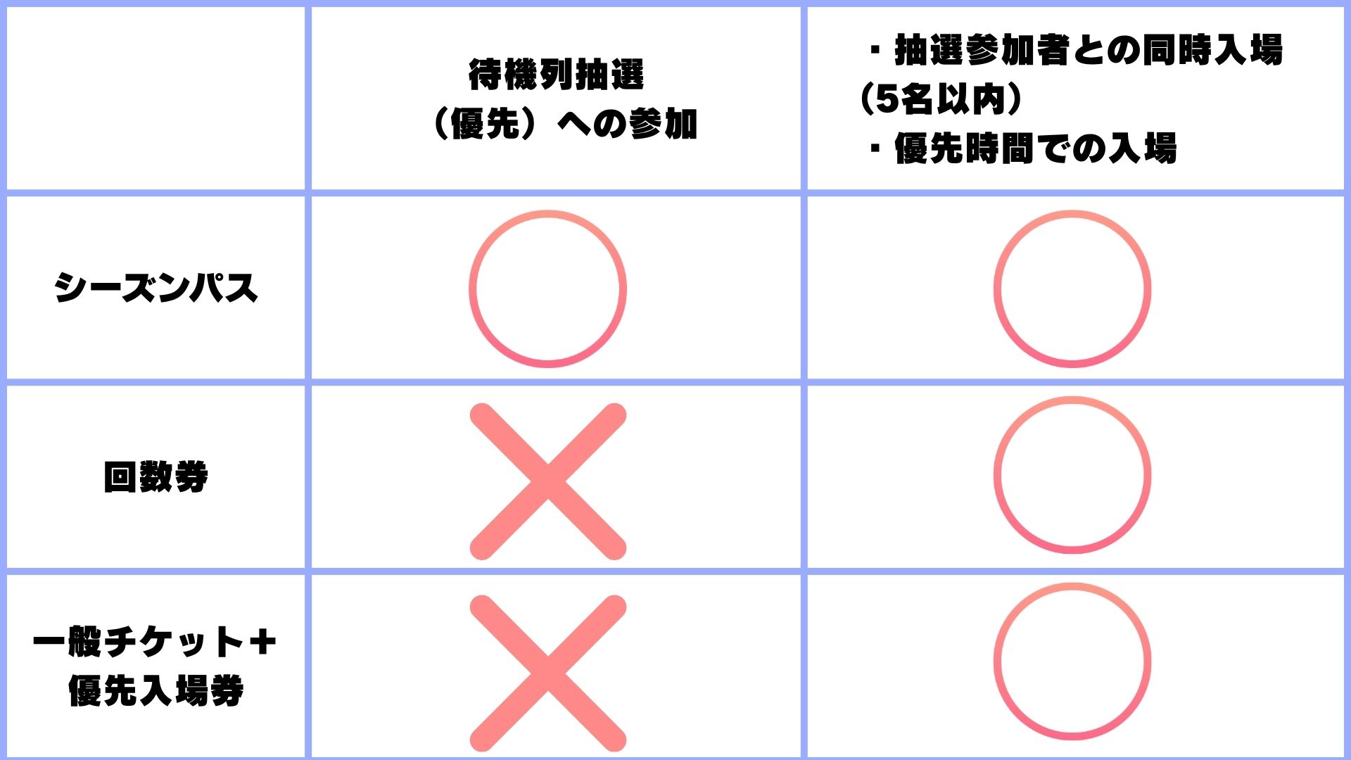 従来回数券をご購入いただいた方で、待機列抽選【優先】へお申込みを希望される方はシーズンパスをご購入いただくようお願いいたします。