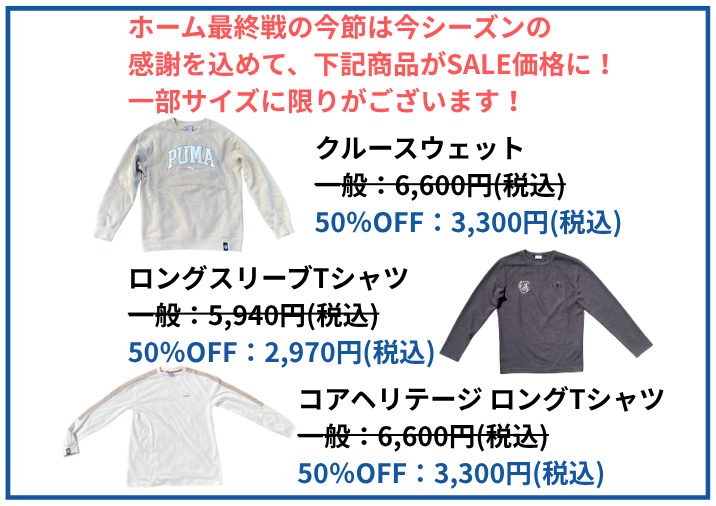 ホーム最終戦の今節は今シーズンの感謝を込めて、一部商品がSALE!