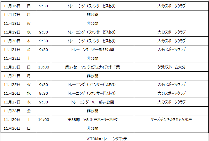 トップチームのトレーニング(11月16日~11月30日)スケジュールについて、以下の通りお知らせいたします。公開トレーニング日の見学においでいただく際には、以下の概要、注意点をご確認いただき、ご来場ください。