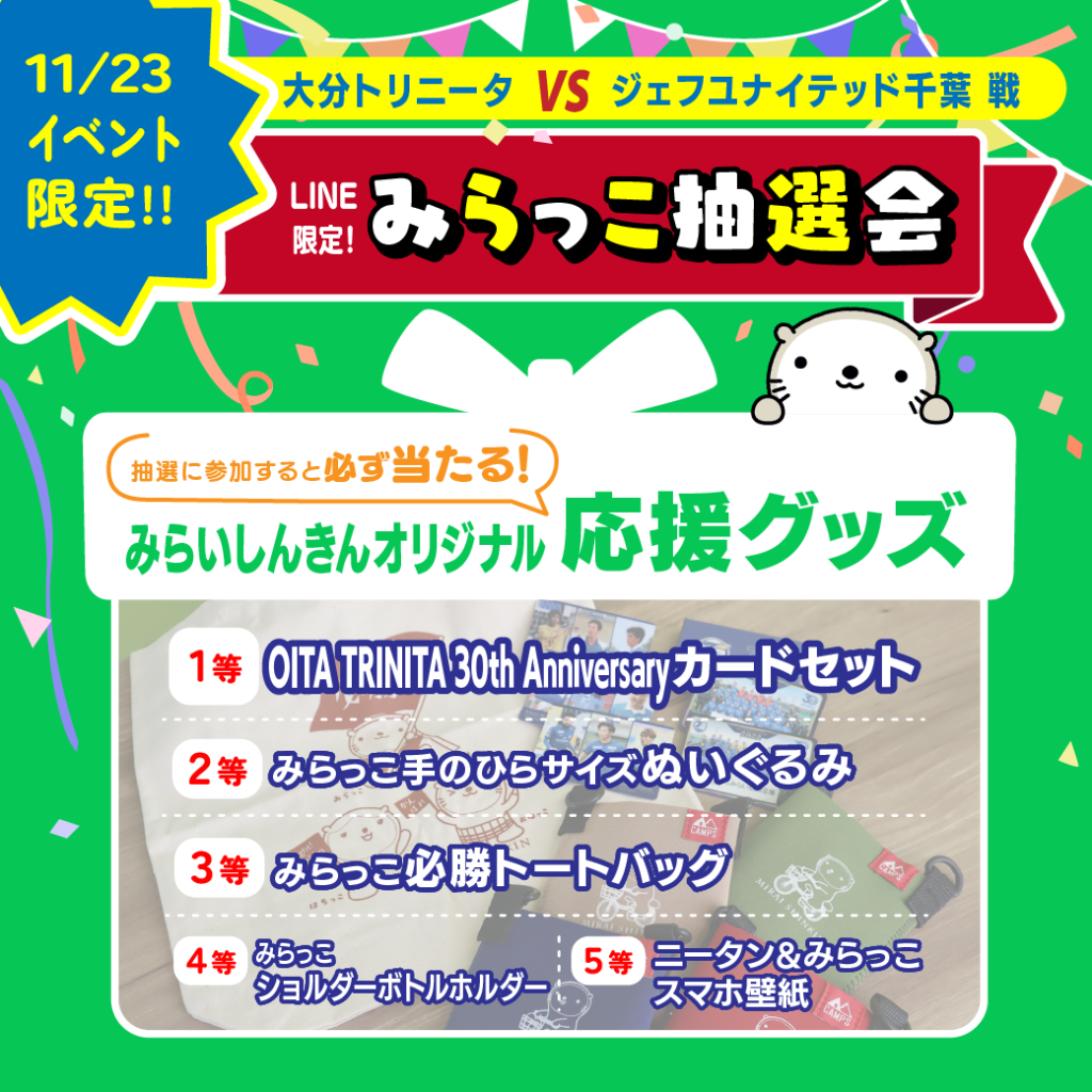 11月23日(日祝)ジェフユナイテッド千葉戦の会場にて、「大分みらい信用金庫」LINE公式アカウント限定イベント《みらっこ抽選》を実施いたします。