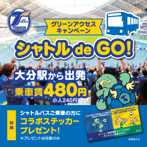 大分駅ースタジアム間をつなぐシャトルバスを利用して、CO2削減に貢献しよう!この日シャトルバスで来場いただいた方には当日限定のオリジナルステッカーをプレゼント。車内も装飾してみなさまをお送りします!