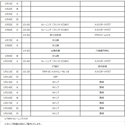【トップチーム】トレーニングスケジュール(1月1日~1月19日)について