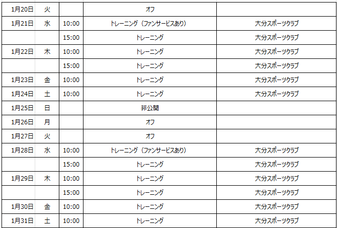 トップチームのトレーニング(1月20日~1月31日)スケジュールについて、以下の通りお知らせいたします。公開トレーニング日の見学においでいただく際には、以下の概要、注意点をご確認いただき、ご来場ください。