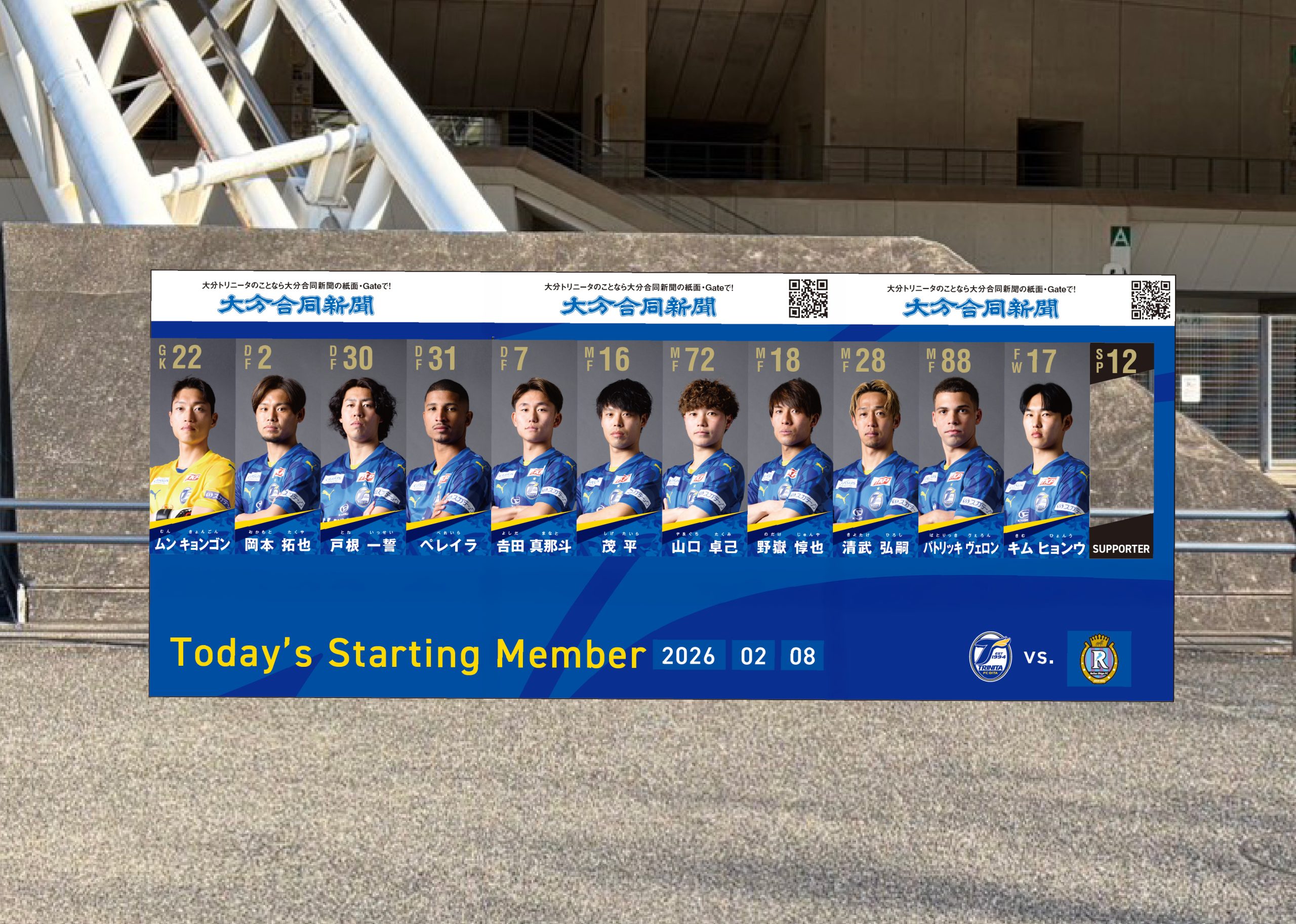 2026明治安田J2・J3百年構想リーグ大分トリニータホーム開幕戦より、スタメンボードを設置いたします。当日のスタメン選手のボードの横は、顔出しパネルとなっていますので、ぜひ新たなフォトスポットとして観戦の記念にご利用ください!
