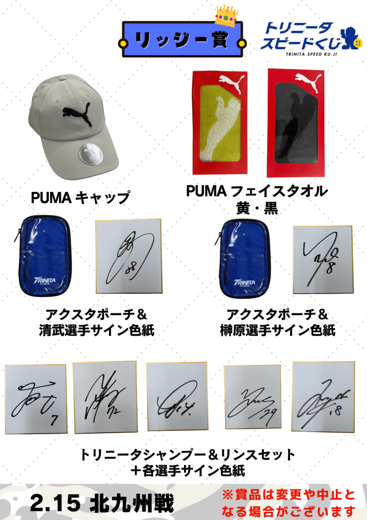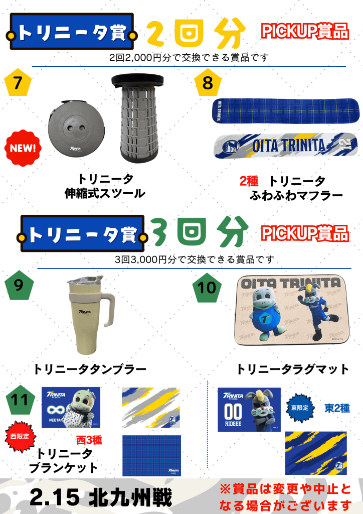 ※2/8に賞品として予定していた【アクリルスタンプ3種】、【ユニ型クッションキーホルダー2種】につきましては、下記の試合に代替予定です。