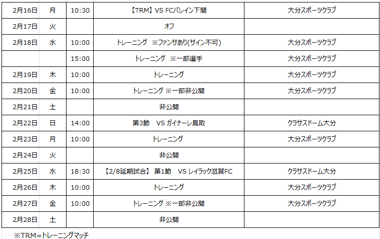 【トップチーム】トレーニングスケジュール(2月16日~2月28日)について