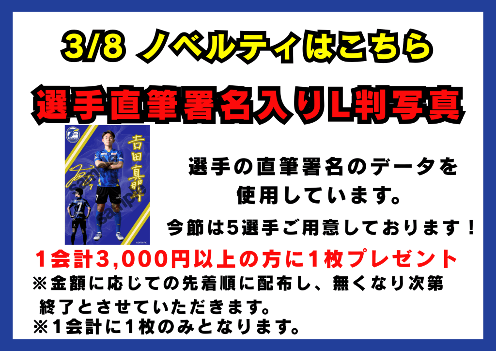 今節は1会計3,000円以上の方に選手直筆署名入りL判写真をプレゼント!