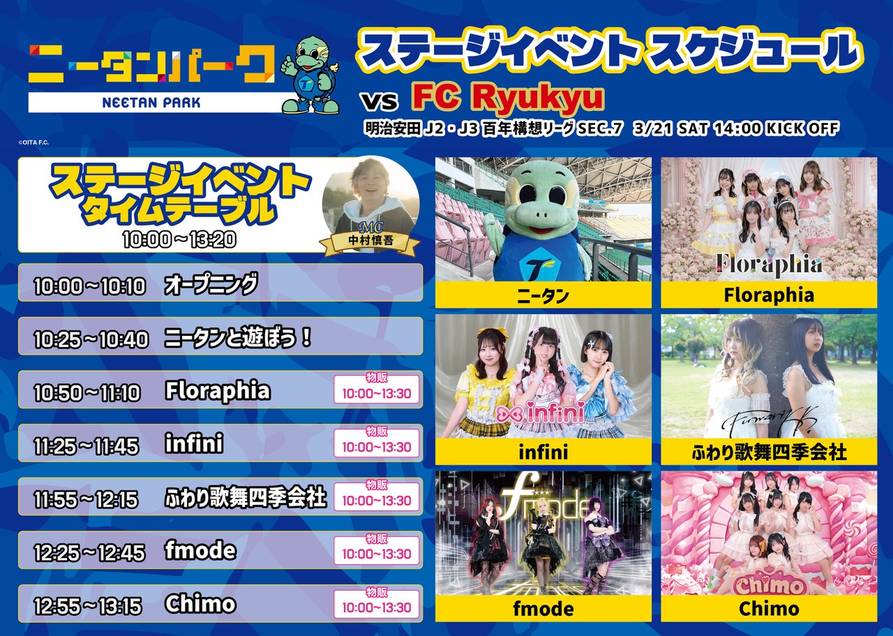 【イベント】3/21琉球戦 「ニータンパークステージイベント」情報 2026/03/16 ◇3/21(土)ニータンパーク ステージイベント情報◇ 【実施場所】 ニータンパーク(屋外) 【実施時間】 10:00~13:20 机と椅子をご用意しておりますので、ぜひ美味しいグルメを食べながらステージをお楽しみください!