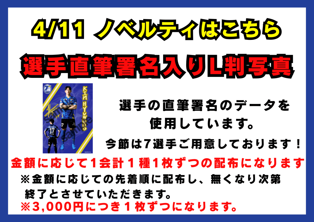 今節は1会計3,000円以上の方に選手直筆署名入りL判写真をプレゼント!