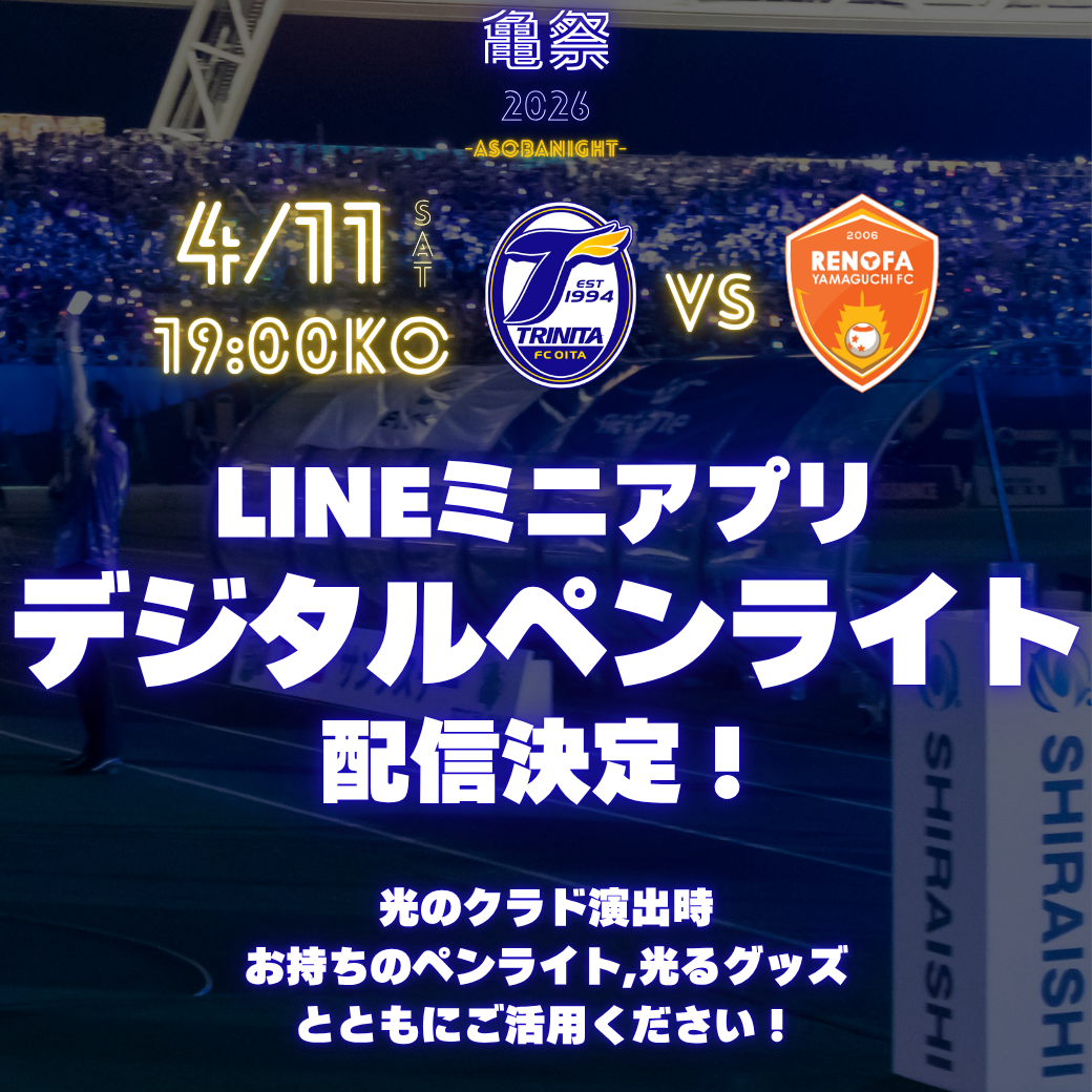 4月11日(土)19:00キックオフの明治安田J2・J3百年構想リーグ 4月11日(土)レノファ山口FC戦にて開催される「亀祭 -ASOBANIGHT-」にて「光のクラド」演出時に使用いただけるxTension社提供のLINEミニアプリ「xTensionデジタルスマホペンライト」の配信が決定いたしました!