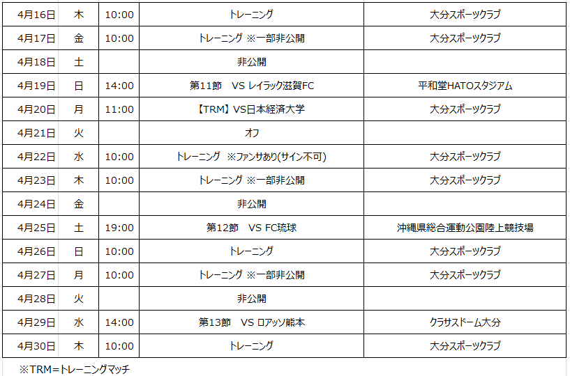 【トップチーム】トレーニングスケジュール(4月16日~4月30日)について