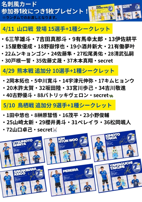| ブース | ・射的 ・輪投げ ・スーパーボールすくい【4/29 熊本戦 限定】 ・水ヨーヨーつり【5/10 鳥栖戦 限定】 |