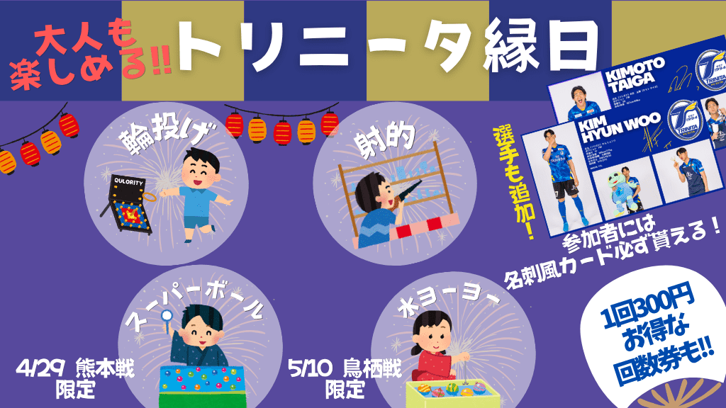 大好評につき、4/29(水祝)ロアッソ熊本戦・5/10(日)サガン鳥栖戦にてトリニータ縁日を開催いたします。