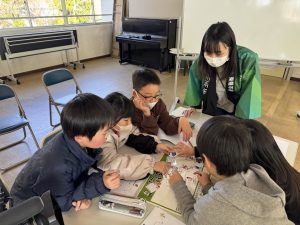 『Future Kid Takara』の総集編ほか1編をみんなで一緒に見て、松本アンバサダーから、いま、気候変動問題が顕在化していて、異常気象が頻繁に起こっていることなどの解説がありました。プロのサッカー選手の口から、いかに夏の炎天下の中でサッカーすることが大変なことか、どんな気持ちでいるかといったことを聞き、生徒さんたちも目を丸くしていました。その後、自分たちでもできそうなそれぞれの気候アクションが、どんな環境問題への解決につながるかについて分かりやすくパズルなどを使ってグループワークを行いました。
