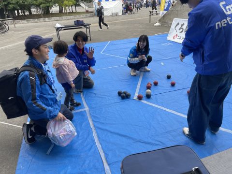当日の体験ブースは西口広場ニータンパークで「ボッチャ」を実施しました。競技補助として大分大学ASC(アダプテッドスポーツクラブ)の皆さんが担当しました。