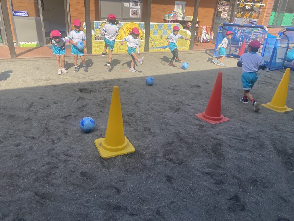 コーン当てでは、最初はコーンにボールが当たらず苦戦している様子が見られました。コーチが「体をコーンのほうに向けて、ボールを真っすぐ蹴ろう」とアドバイスすると園児たちは、沢山コーンに当てることができていました。当てるたびに「やったー!」と喜びの声があがり、何度も挑戦する姿が見られました。