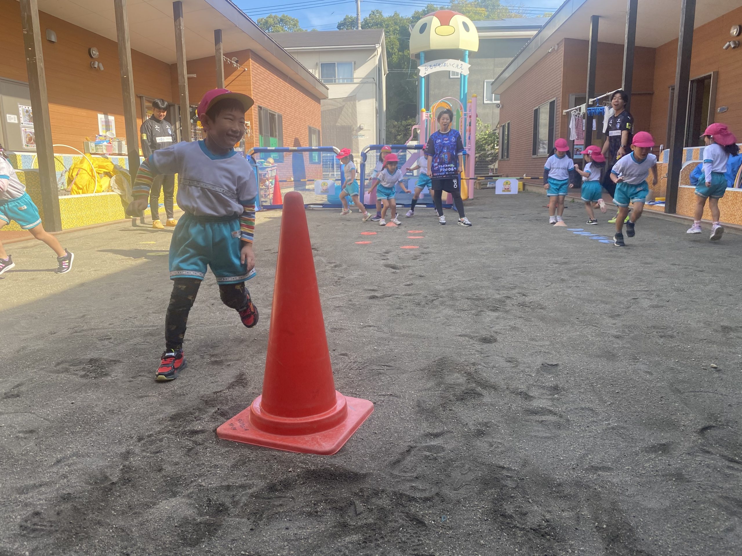 コーン当てでは、最初はコーンにボールが当たらず苦戦している様子が見られました。コーチが「体をコーンのほうに向けて、ボールを真っすぐ蹴ろう」とアドバイスすると園児たちは、沢山コーンに当てることができていました。当てるたびに「やったー!」と喜びの声があがり、何度も挑戦する姿が見られました。