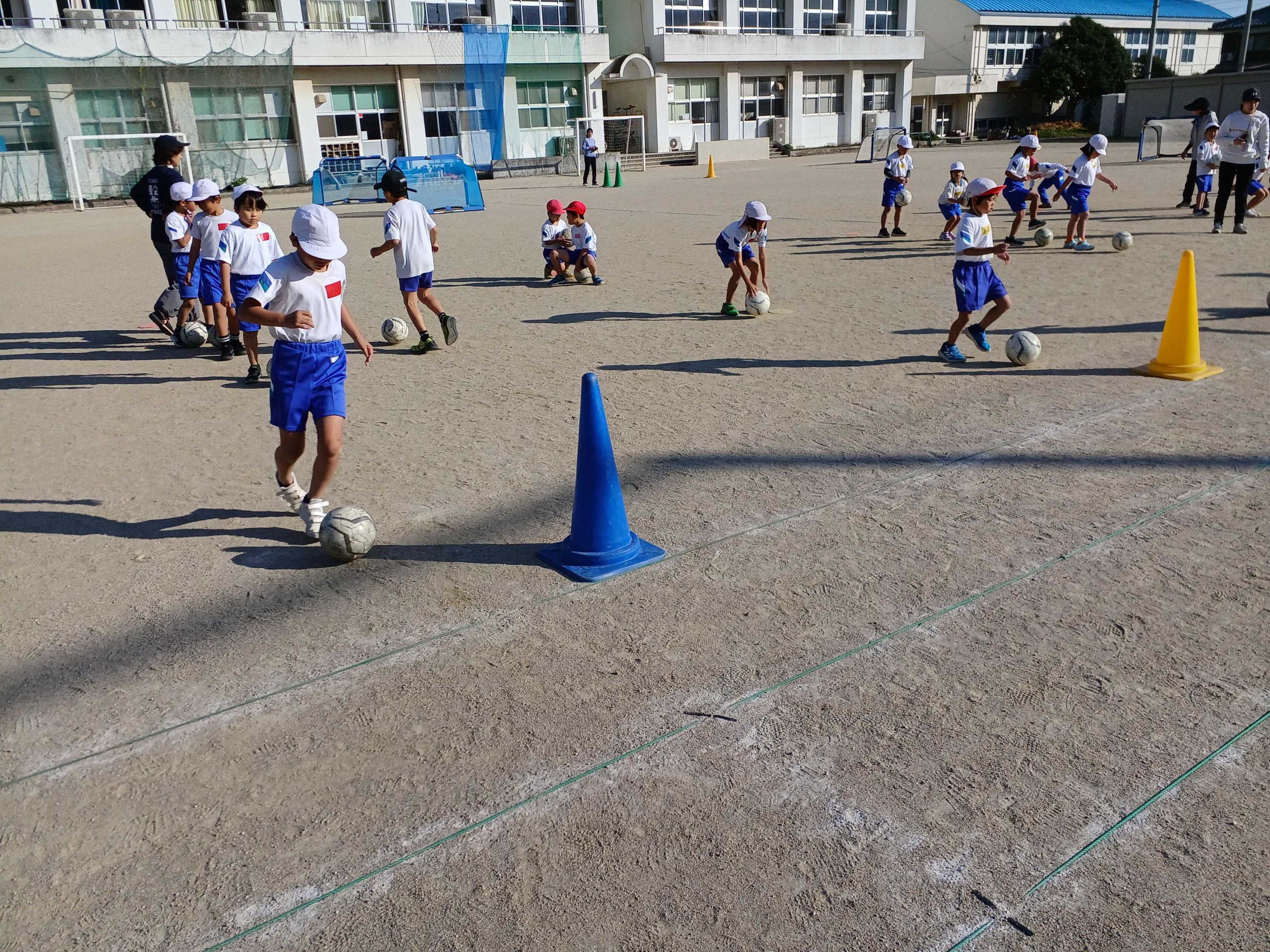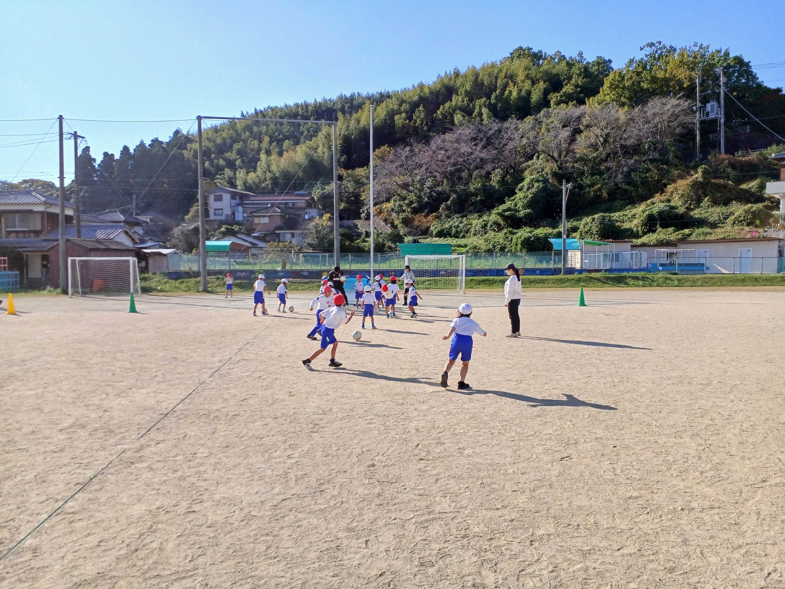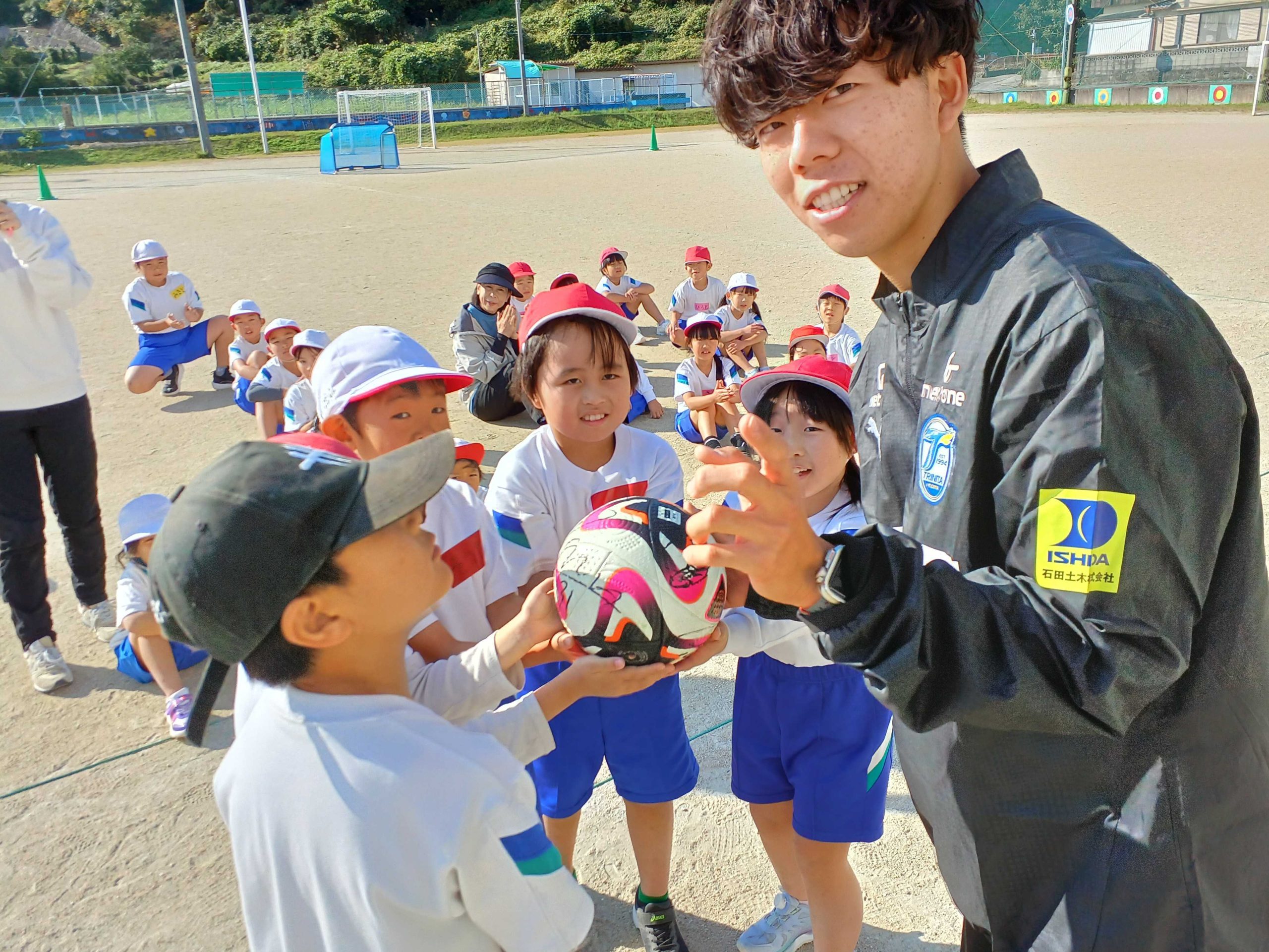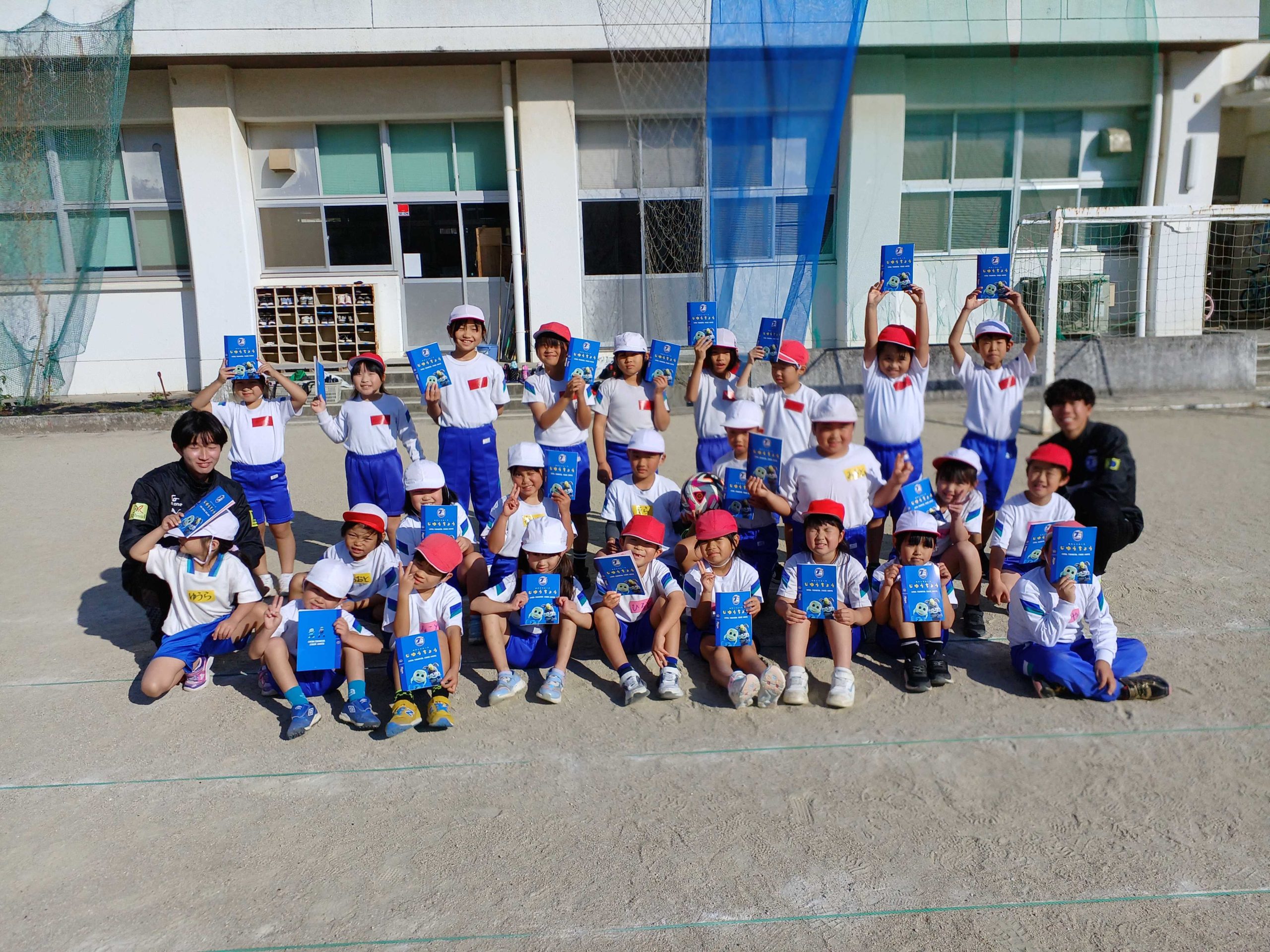 【スポーツによる地域の元気づくり事業】臼杵市立海辺小学校 2025/12/23 11月20日(木)に臼杵市立海辺小学校を訪問し、全校生徒57名を対象にサッカー教室を行いました。 最初にコーンドリブルやコーン当てを行いました。うまくドリブルができない生徒もいましたが、コーチが「細かくボールを触ること」などのポイントを伝えると、多くの生徒が上手にドリブルできるようになりました。 ミニゲームではシュートをねらう生徒と、ゴールを守る生徒に分かれてチームで協力する姿が見られました。 最後に自由帳・公式球・チケットをプレゼントすると、子どもたちは嬉しそうにしていました。 生徒からは「サッカー教室を体験して、さらにサッカーが好きになった」との感想をいただきました。
