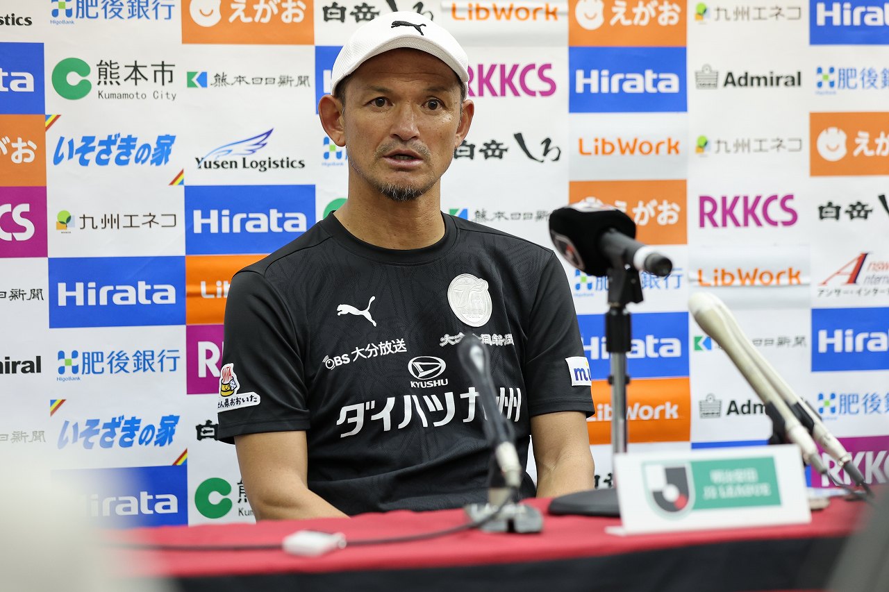 九州ダービーで、われわれにとっても熊本さんにとっても非常に大きなビッグマッチだった。そこで大分のサポーターの方たちにホームのような雰囲気を作っていただき、ありがとうございました。また、熊本のサポーターの方たちもわれわれのバス到着の時に出迎えてくださり、完全にアウェイの雰囲気をもたらしてくれ、それもわれわれの力の源となった。そういう雰囲気の中でお互いが戦えたことで、本当に選手は幸せだったと思うし、この戦いを運営してくださった方々、サポートくださった方々も、ありがとうございました。