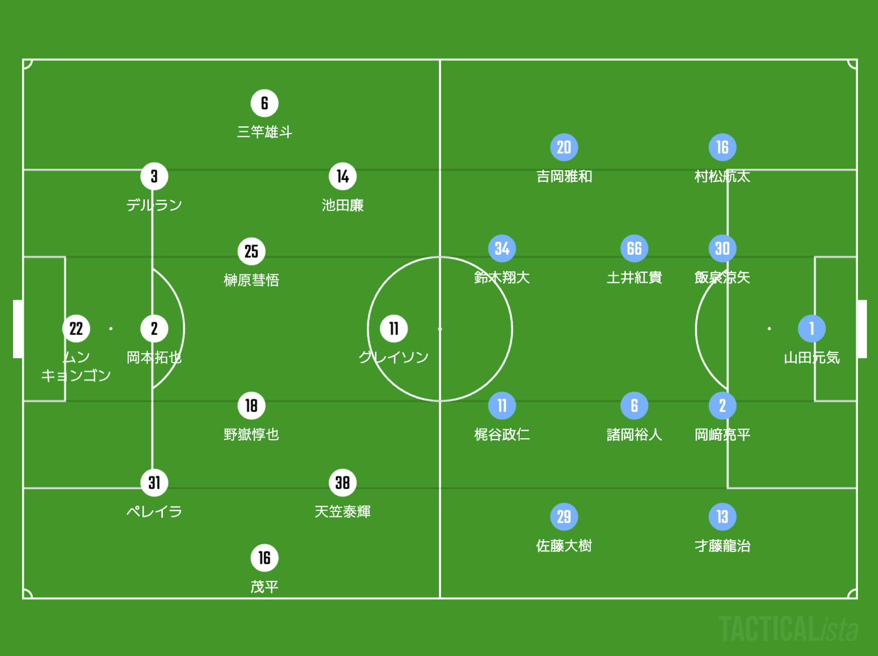 61分には榊原彗悟のクロスとペレイラの折り返しがクリアされる。62分にはペナルティーエリアに進入していたペレイラからのパスを受けデルランがシュートして枠を捉えきれない。