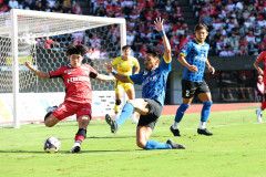 ミドルブロックを構えながら連動して球際へも寄せる大分と、しつこいまでのマンツーマンディフェンスで相手に自由を与えない熊本。それぞれに特徴的な守備を攻略しようと、大分は相手のマークを剥がすためにあの手この手を凝らし、熊本は得意のスピーディーなパスワークを繰り出すが、どちらも守備のほうが上回るゲーム展開となる。