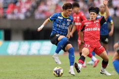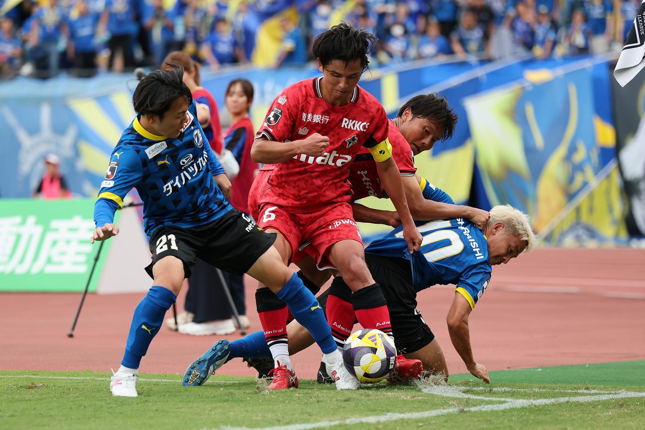 35分、三竿雄斗の右CKはデザインに忠実にファーの伊佐に渡ったが、その折り返しがデルランに深く入り、左腿で押し込もうとしたが半代と佐藤史騎に掻き出される。その1分後には熊本も絶好機。右に流れていた藤井のアーリークロスをゴール前で胸トラップした塩浜遼がすかさず右足で狙ったが、弾道はわずかに上に逸れた。45分には天笠泰輝のスルーパスに抜け出した池田廉が自ら持ち込んでシュートを放ち、枠の右へ。45+3分の榊原彗悟のFKは枠の左へ。