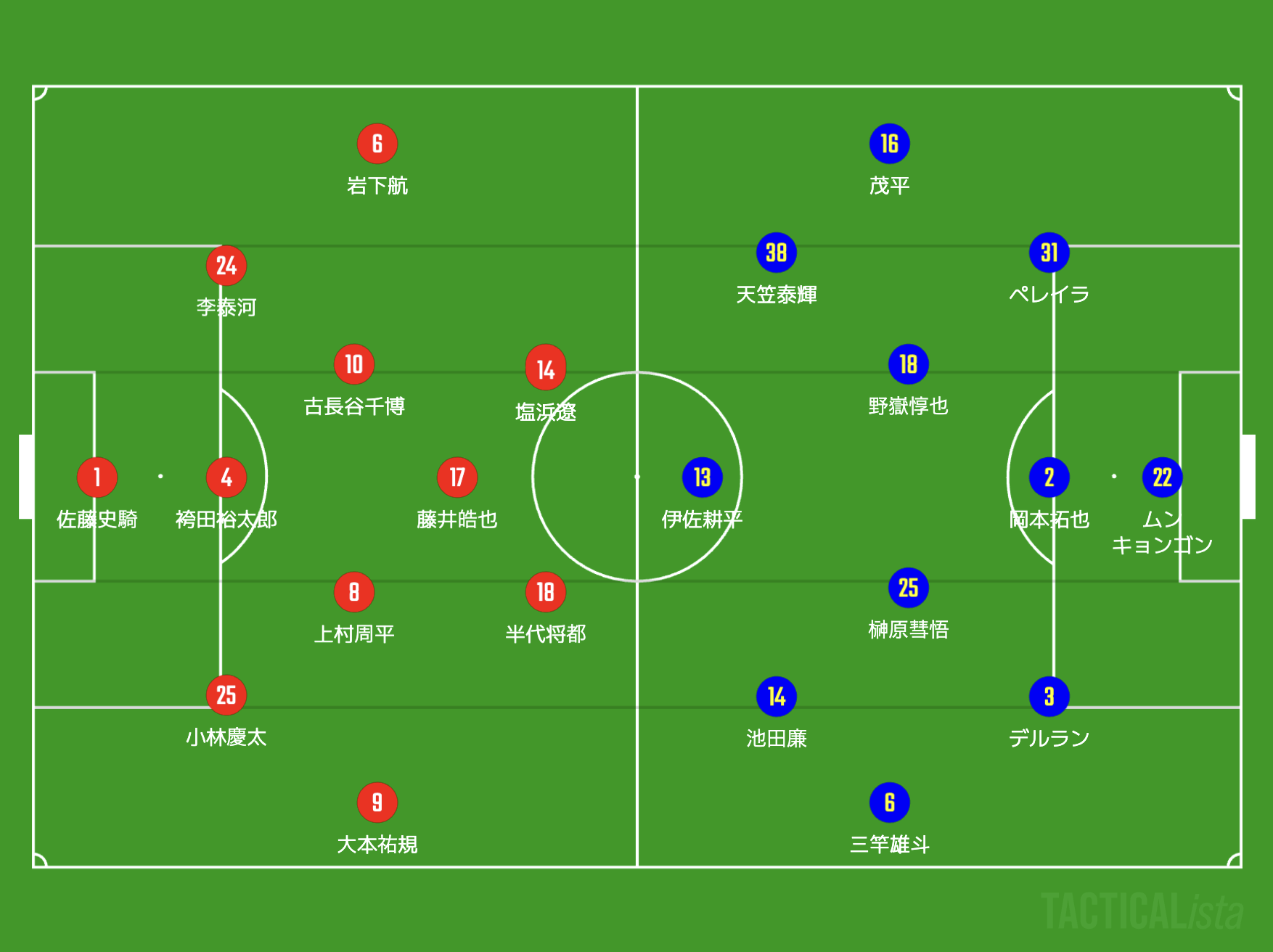 互いに潰し合いの要素が強く、セットプレーでの得点がカギになりそうな堅い展開の中でも、回数は少ないながらそれぞれにチャンスを築いて試合は0-0で折り返した。