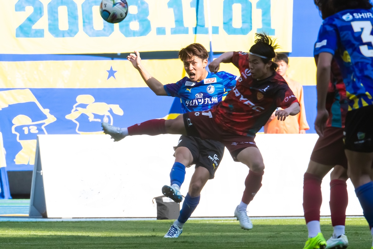 立ち上がりから互いに攻守の駆け引きがスタートした中で、ペースを握ったのは大分。8分、押し込んだ状態から戸根一誓がゴール前に浮き球を送ると、この試合でプロ初先発した櫻井勇斗が頭で合わせ、枠の上へ。