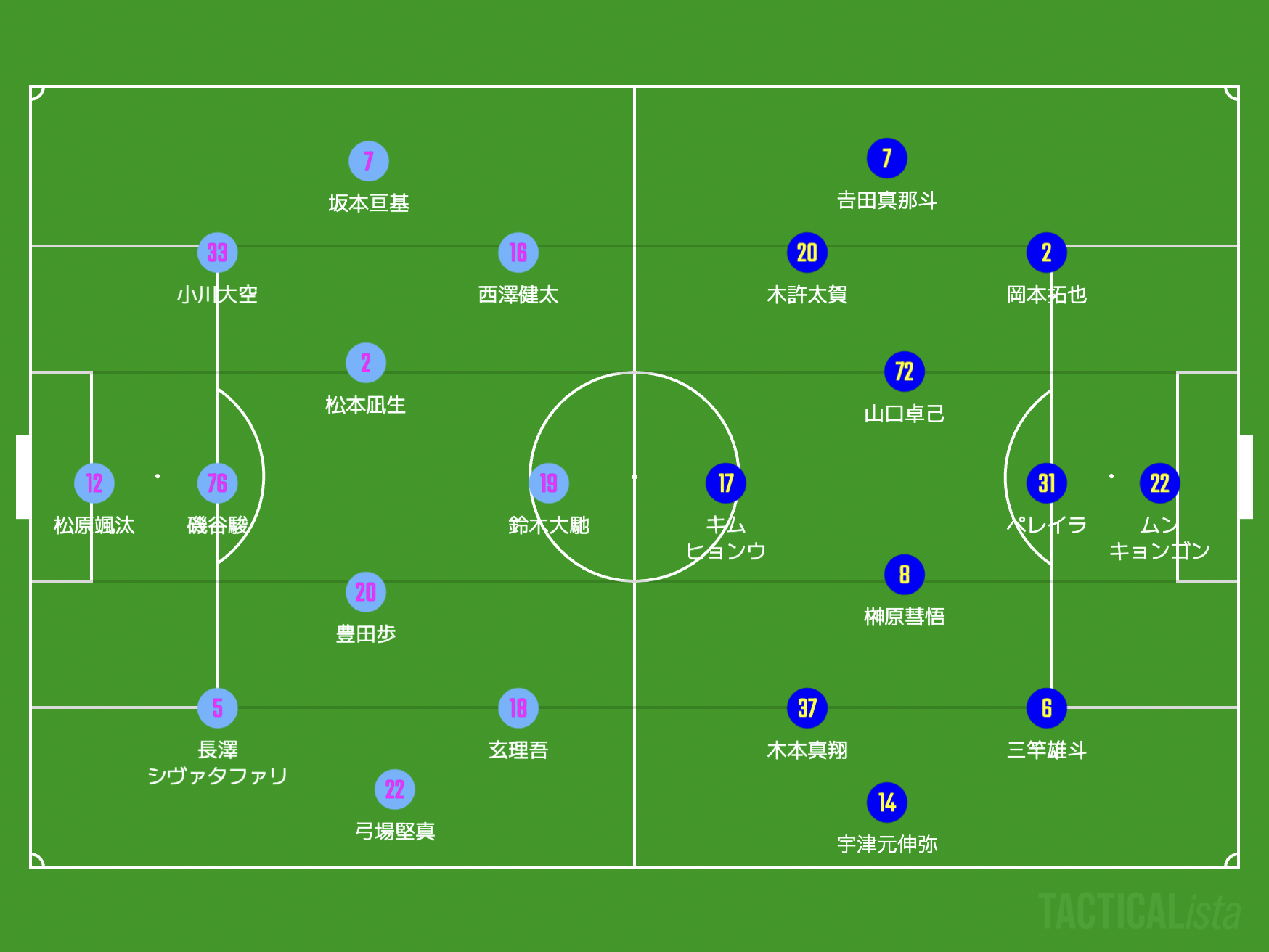 第5節からシステム変更した鳥栖との3-4-2-1でのミラーゲーム。今週のトレーニングではそれに向けての守備戦術も準備していたのだが、実際の試合ではそれは用いず、より状況を見ながら柔軟に前線からハメていくかたちを採用していた。5試合ぶりの出場となったキムを含め前節から前線3人を入れ替え、ボランチの一角には山口卓己、左CBには三竿雄斗が復帰してのスタートとなる。