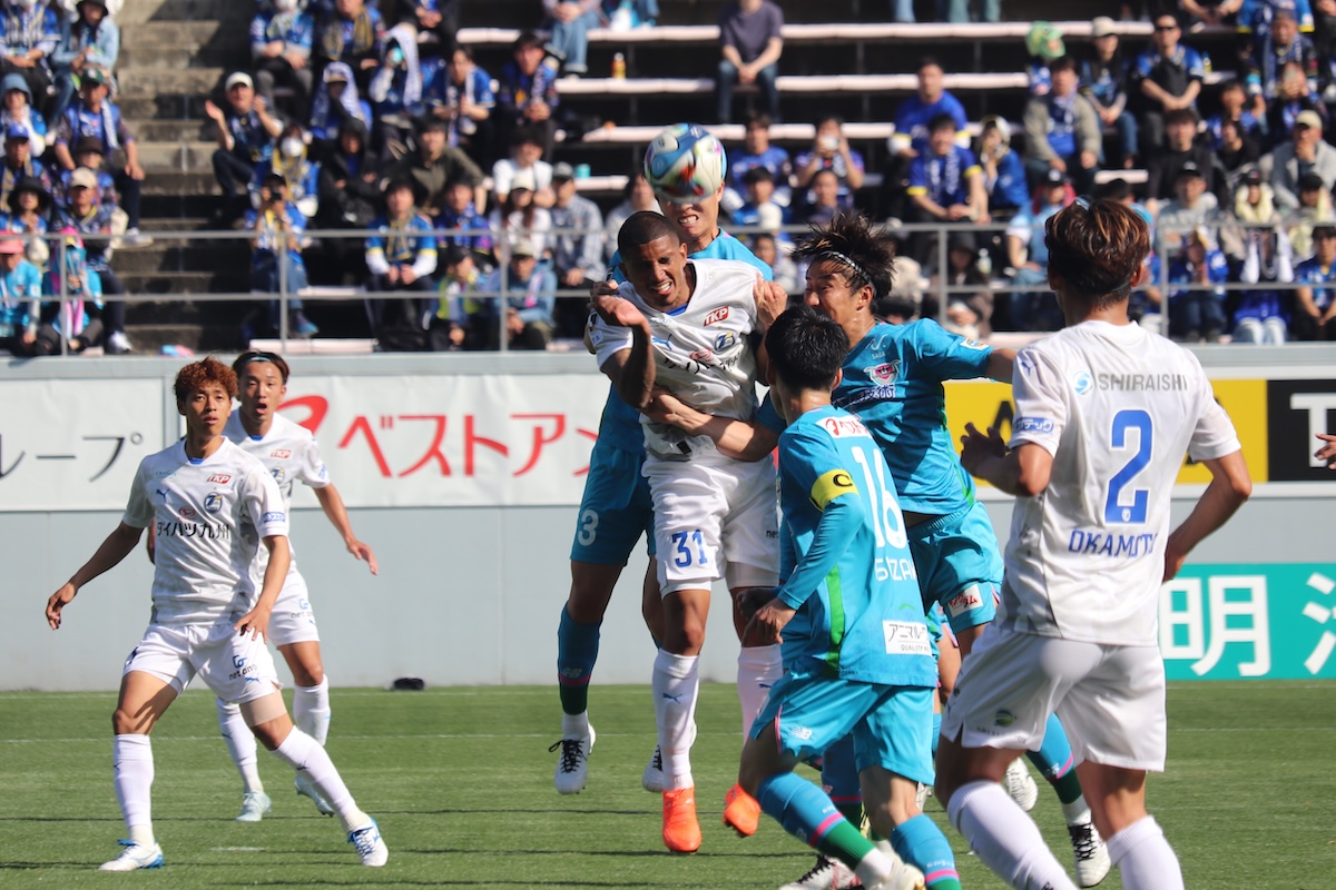 6分、ムン・キョンゴンのフィードを宇津元伸弥がヘディングで前に送ったところから、木本真翔がスペースに送って宇津元が折り返しキムがゴールへと流し込んだが、宇津元のクロスのところでわずかにゴールラインを割っており得点は認められず。10分には相手のゴールキックを前に出てマイボールにしたペレイラが自ら左サイドを持ち上がりスルーパスを送るシーンも。それは繋がらず相手の速攻を受けることになり、ペレイラは帰陣できていなかったが、榊原がカバーに走る中、西澤健太と弓場堅真の2人に三竿雄斗が1人で対応するなど、組織のみならず個々の強度も醸す立ち上がりとなった。